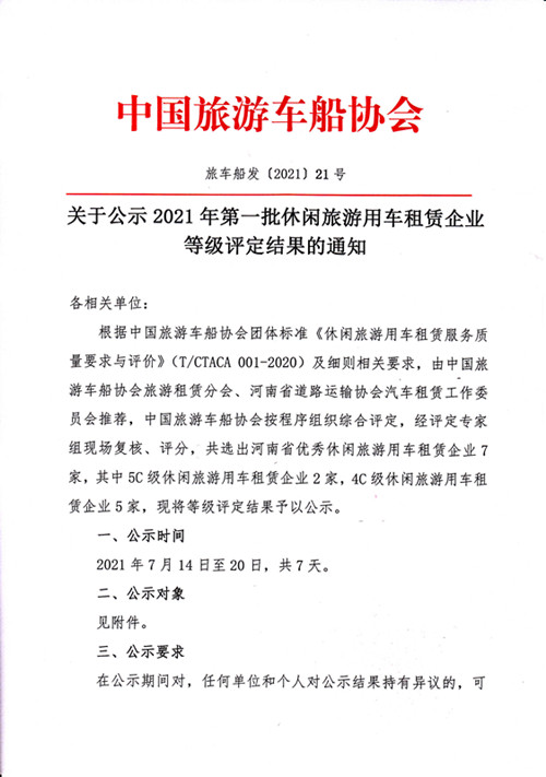 关于公示2021年第一批休闲旅游用车租赁